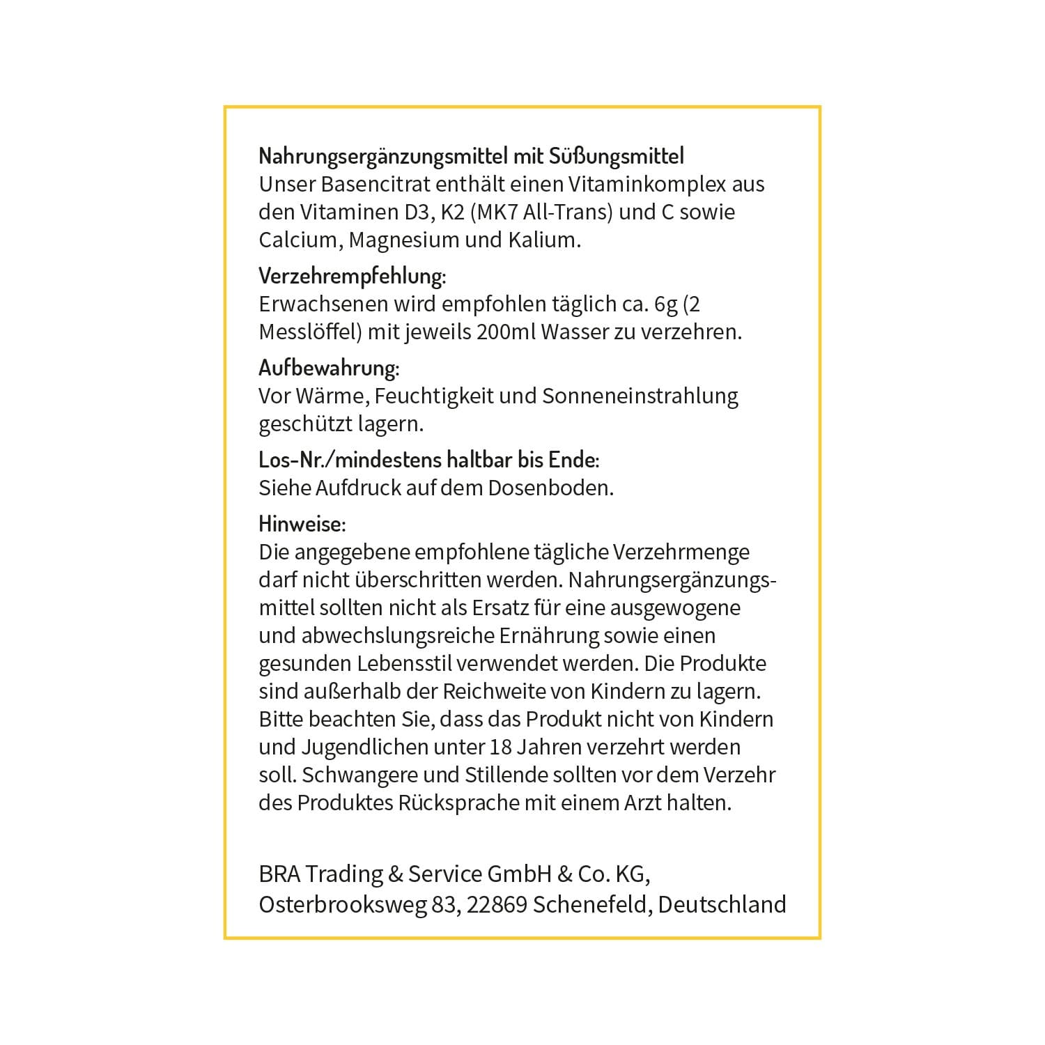 Unser Basencitrat enthält einen wertvollen Vitaminkomplex. Enthalten sind die Vitamine C (gewonnen aus Camu-Camu Extrakt), D und K2 in der Form MK7 All-Trans. Darüber hinaus haben wir Calcium, Kalium und Magnesium in einer einzigartig abgestimmten Kombination hinzugefügt.