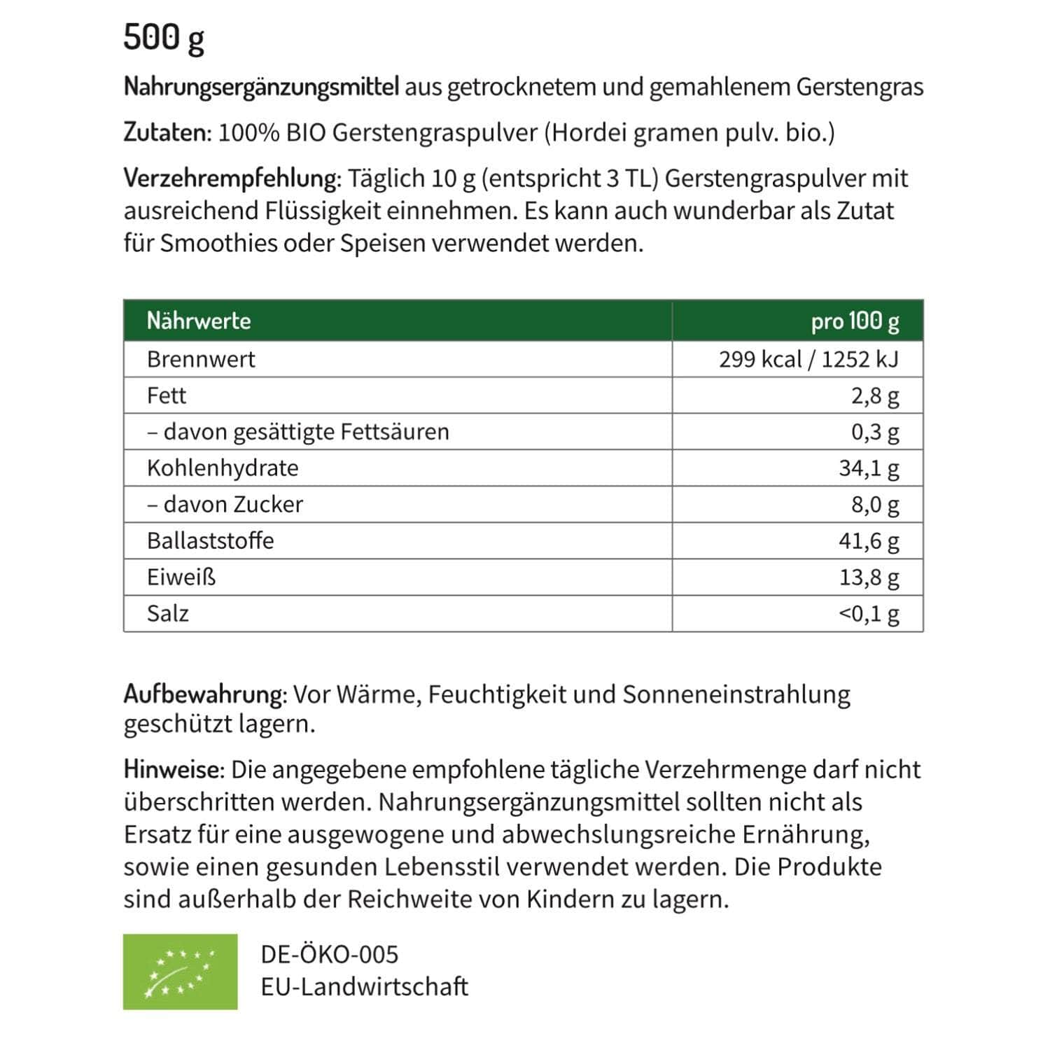 Bei diesem Produkt verwenden wir 100% Gerstengras aus biologischem Anbau und verzichten bewusst auf unnötige Hilfsmittel und Zusatzstoffe und achten auf eine reine Qualität.