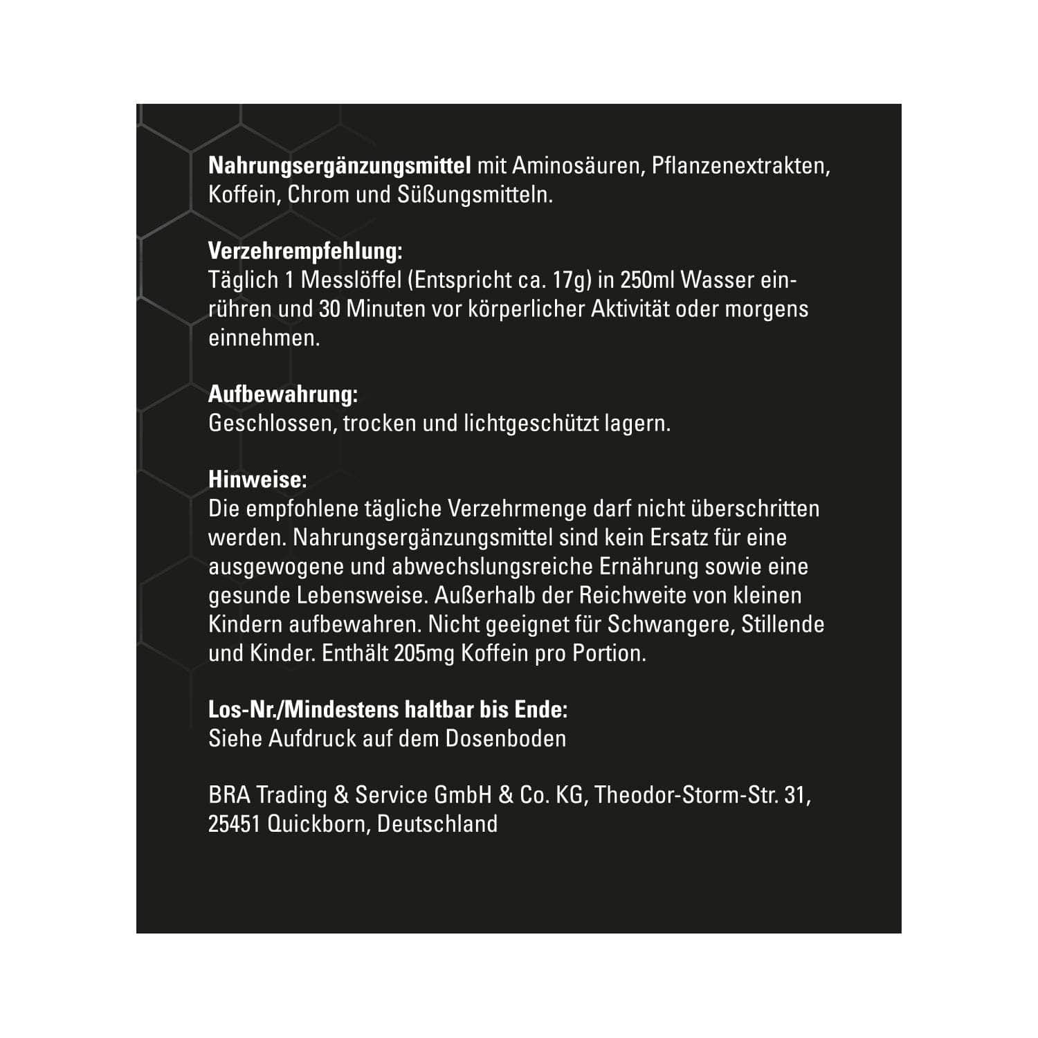 Wir empfehlen täglich 1 Messlöffel (ca. 17 g Pulver) in 250 ml Wasser einzurühren und etwa 30 Minuten vor dem Training oder morgens einzunehmen.